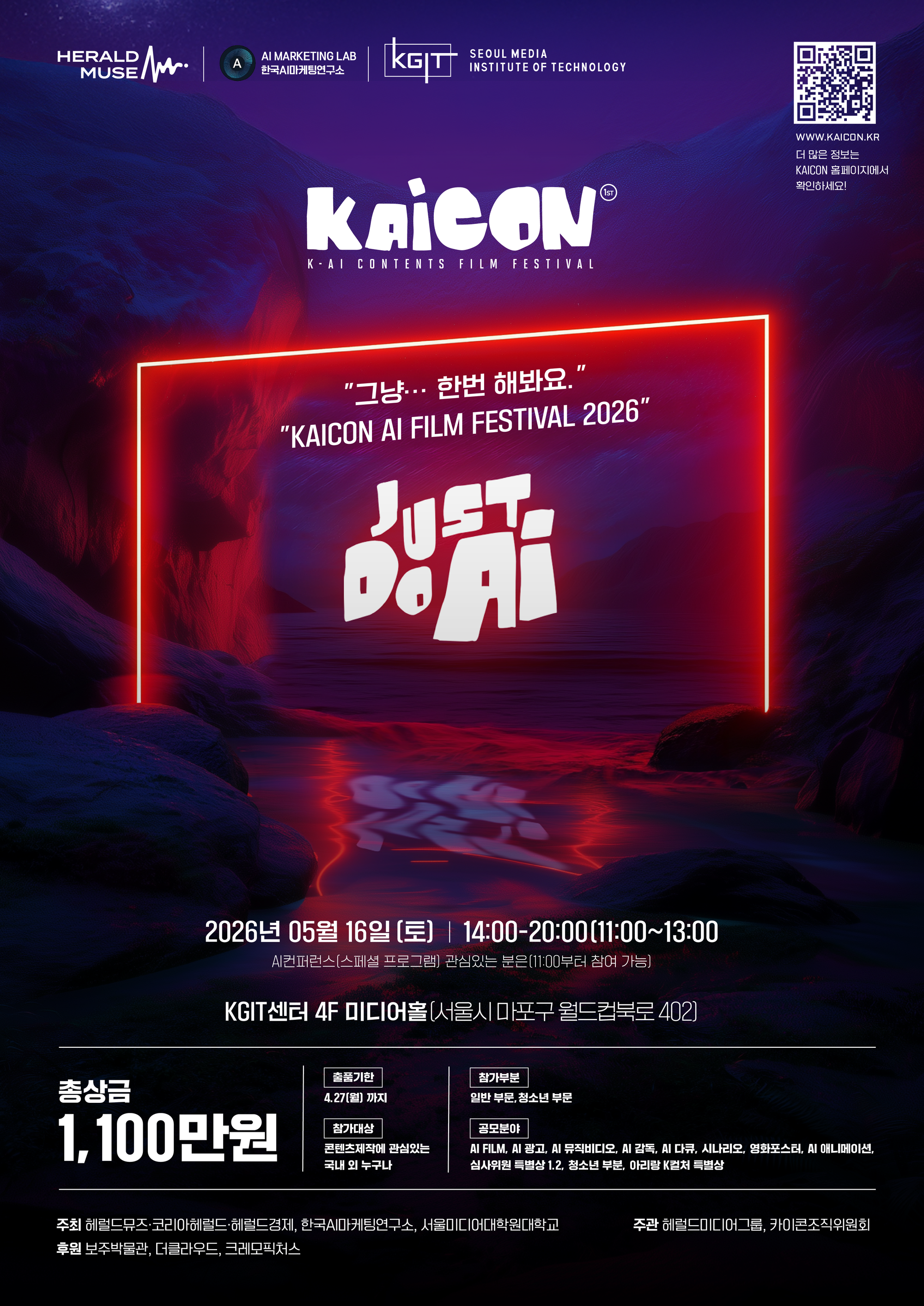출품에 관한 정보는 공식 홈페이지와 출품 사이트를 참고하시면 좋겠네요. 출품기한은 2026년 4월 27일까지입니다. 결과발표는 5월 5일이고, 영화제 개최는 5월 16일입니다. 공식 출품 사이트를 꼼꼼히 살펴보시고 기한(4월 27일)을 지키셔서 제1회 KAICON <AI Film Festival>을 통하여, AI를 활용한 창작의 새로운 가능성을 제시하고 더 많은 창작자들이 도전할 수 있는 계기가 되기를 진심으로 바랍니다. 요즈음처럼 빠른 변화 속에서 KAICON은 AI와 인간의 협업을 통해 만들어지는 새로운 장르의 영화와 창작의 가능성을 세상과 공유하고자 기획한 영화제입니다. 기술과 예술이 만나는 지점에서 기존의 틀을 넘어서는 자유로운 창작과 실험을 지향하며 이를 통해 전 세계 창작자들과 함께 글로벌 콘텐츠 플랫폼으로 성장하고자 합니다. 영화제에서 12개 장르, 17명(팀)의 수상을 기다리고 있습니다. 상금은 총 일천백만 원입니다.”